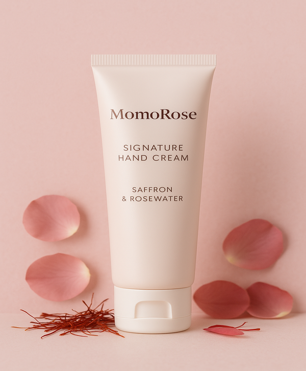Indulge your hands in a moment of pure self-care. The MomoRose Signature Hand Cream is a silky, fast-absorbing formula crafted with premium saffron, pure rosewater, and deeply nourishing botanicals.